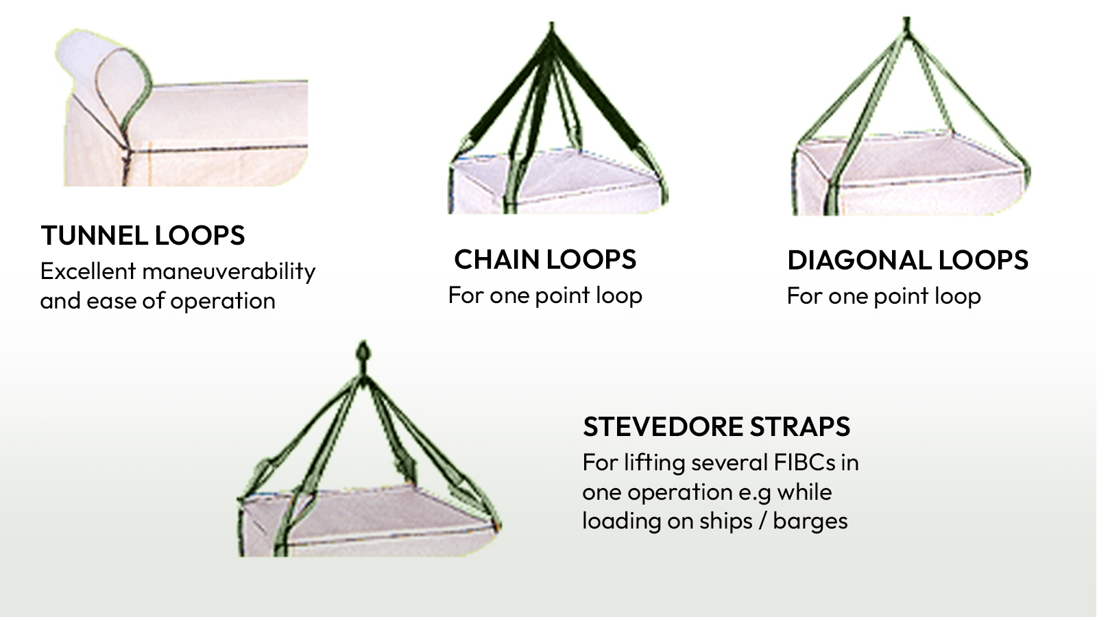 1. Loop Patterns (Lifting & Handling Options): Loop patterns define how the bag is lifted using forklifts or cranes. Standard options include corner loops for balanced lifting, cross-corner loops for improved stability, tunnel loops for single-operator forklift handling, single-loop bags for lightweight use, and two-loop bags for better control and easier hoisting.