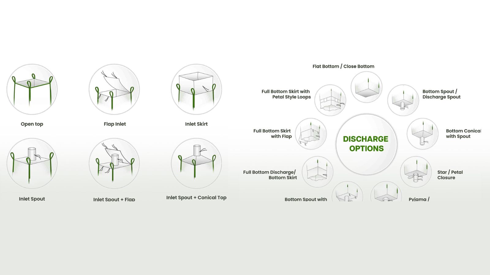 3. Discharge Options: Discharge patterns determine how material exits the bag. Flat bottoms are sealed for single-use cutting, discharge spouts allow controlled emptying, conical bottoms assist smooth flow of sticky materials, full drop bottoms enable instant discharge, and iris/petal bottoms offer precise flow control.